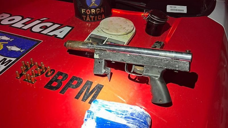 Durante a vistoria, o comportamento do suspeito mudou e ele acabou confessando que guardava drogas e uma arma artesanal. No quarto do casal, os militares localizaram uma submetralhadora de calibre 9mm, de uso restrito, acompanhada de 14 munições, além de 275 gramas de cocaína, 30 gramas de maconha e uma balança de precisão.