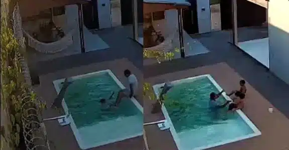 Câmeras de segurança registraram o instante em que um pai salvou seus dois filhos de um possível afogamento na piscina da residência onde moram, no Residencial João Lopes, em Arapiraca. O caso ocorreu na tarde desta segunda-feira (1º) e por pouco não terminou em tragédia.